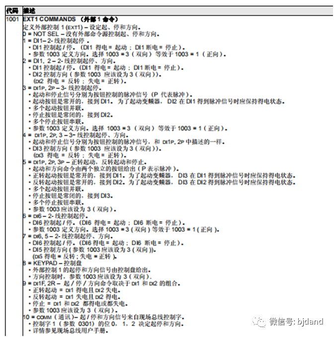 變頻器調(diào)試過程中,必須確保參數(shù)設(shè)置和端子接線的對應(yīng)。下面是ACS510啟動/停止/方向參數(shù)的設(shè)置選項,任何一個選項都可以實(shí)現(xiàn)對變頻器外部控制1的運(yùn)行/停止/方向控制。