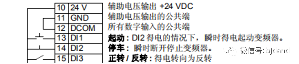 舉例2:如果變頻器的啟動/停止/方向控制信號接到13號(DI1)和14號(DI2)及15號(DI3),其中DI2接常閉按鈕作為停止,DI1接常開按鈕作為啟動,DI3接開關(guān)。當(dāng)DI1收到脈沖后,變頻器啟動運(yùn)行一個方向。DI3置高電平時,變頻器運(yùn)行另外一個方向。當(dāng)DI2(常閉)打開時,變頻器停止運(yùn)行。