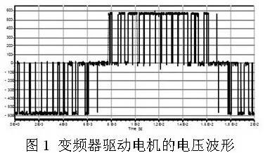 變頻器驅(qū)動(dòng)電機(jī)的電壓波形并不是正弦波電壓,而是脈寬調(diào)制(PWM)電壓,如圖1所示。根據(jù)傅里葉分析,這種波形中包含了豐富的高頻成份,主要頻率成分是PWM脈沖的重復(fù)頻率,及其整倍數(shù)的頻率,PWM脈沖的重復(fù)頻率這叫做變頻器的載波頻率。