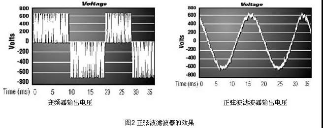 解決電機(jī)過(guò)熱的方法是減小電機(jī)驅(qū)動(dòng)電壓中的高頻成份。實(shí)現(xiàn)這個(gè)目的方法是在變頻器的輸出端安裝SWF正弦波濾波器。正弦波濾波器將PWM電壓波形變換成適應(yīng)于電機(jī)的正弦波電壓波形,如圖2所示,從而消除了電機(jī)過(guò)熱的現(xiàn)象。