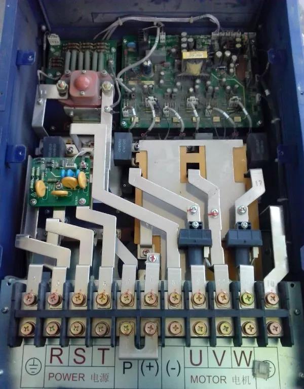 送修一臺匯川MD320系列37KW變頻器,故障現象為上電后機內異響一聲后無反應,關電停機等10分鐘后拆下來檢查: