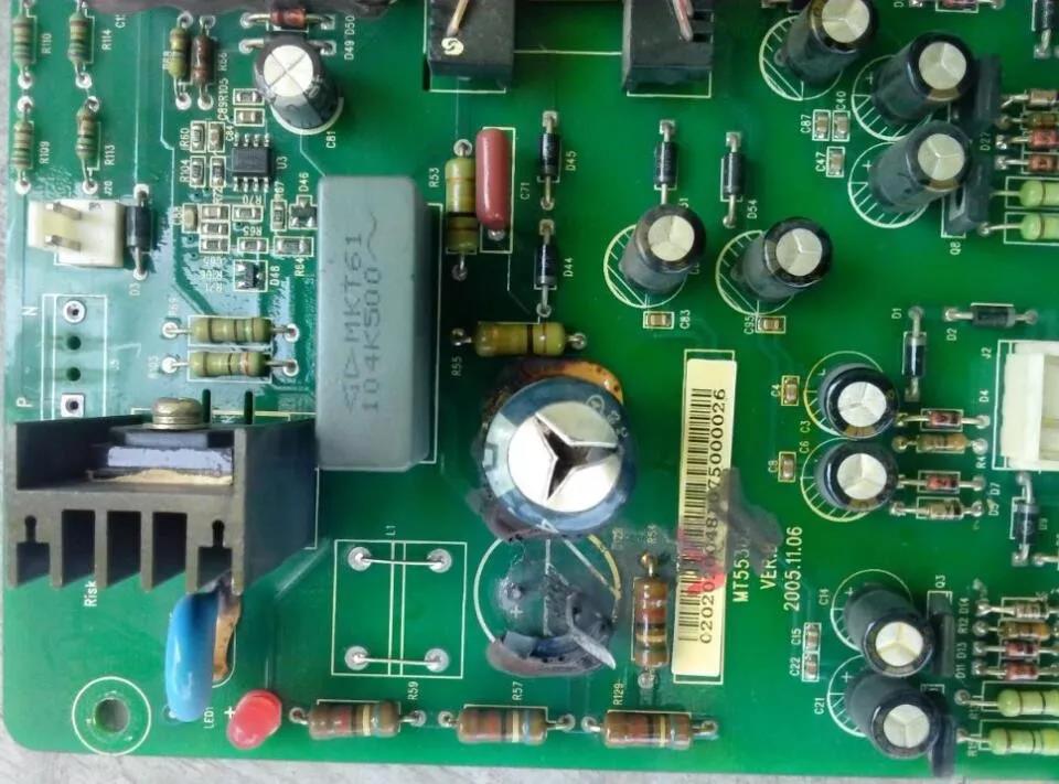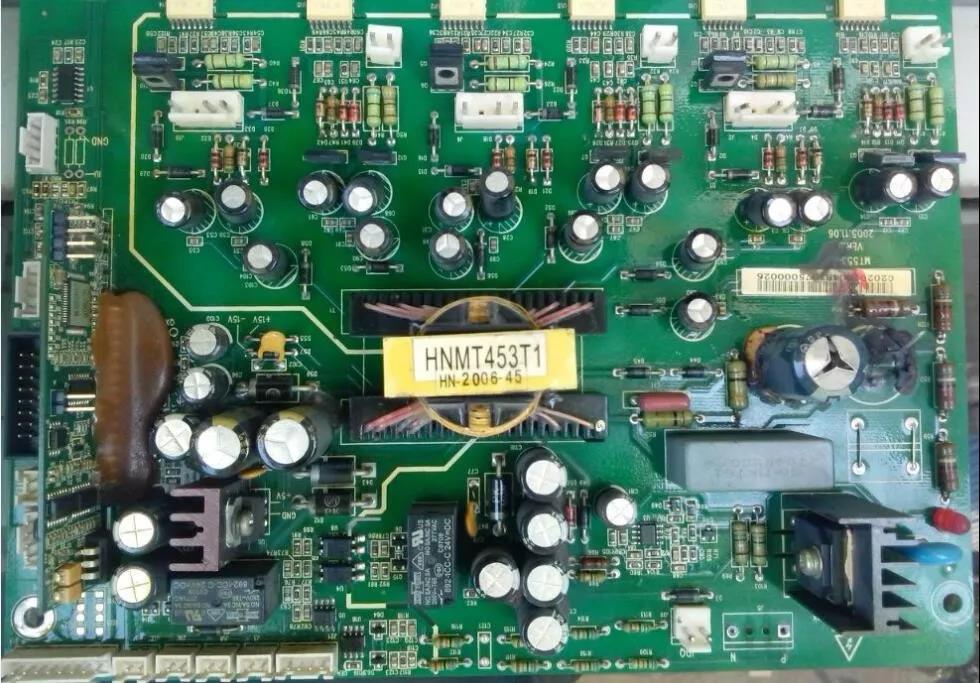 因為之前有過多臺匯川MD320的15KW變頻器維修經驗,對照電路板分析跟15KW原理圖差不多,圖紙就將就參考15KW的修吧。MD320BG  37KW機的框架設計比較好,各功能版相對獨立。首先檢查充電電阻(機器左上角)回路正常,故障點比較明顯的就是兩個450V 47UF電解電容炸,跟換損壞的兩只電解電容,將背面覆銅板燒斷用漆包線連接好。清理電路板的灰塵發現: