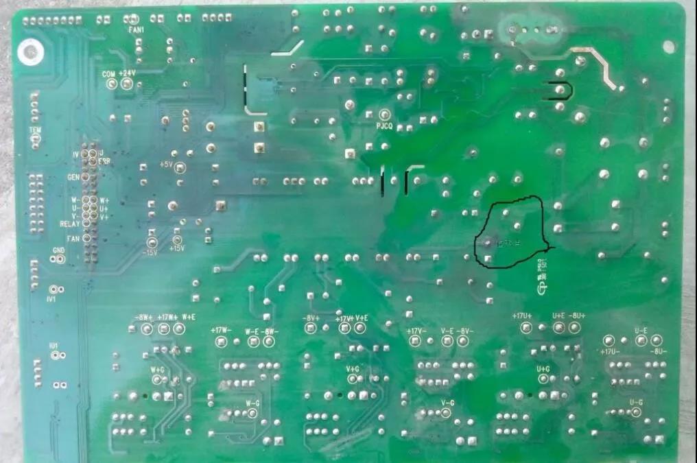 將驅動板從變頻器內拆出來進一步檢查,電路板反面直流母線覆銅板都燒斷了。