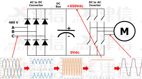 請注意,變頻器的輸出是“矩形”波形。變頻器不產生正弦輸出。對于通用配電系統,這種矩形波形不是一個好的選擇,但對于電機來說是完全合適的。