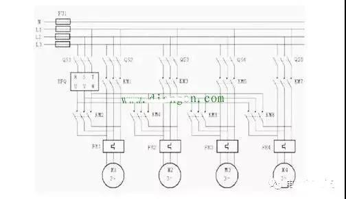 4、用一臺(tái)通用變頻器帶多臺(tái)電機(jī)時(shí)除了使電動(dòng)機(jī)運(yùn)行的總電流小于通用變頻器的額定電流外,還至少要計(jì)算一臺(tái)電動(dòng)機(jī)起動(dòng)電流的影響,以避免變頻器過(guò)電流跳閘。一拖多如下圖: