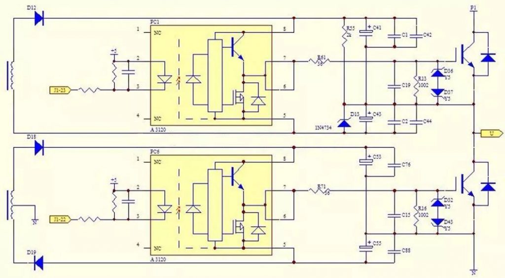 上圖是某變頻器的驅(qū)動電路U相電路圖,V、W相電路相同。從中可以看出,驅(qū)動電路的上下臂工作電源由兩組彼此隔離的電源組成,其中開關(guān)變壓器的一個繞組、D12、C41、C42、C43、C44、穩(wěn)壓二極管D13一起構(gòu)成上臂驅(qū)動電路的工作電源,光耦PC1-A3120的8腳和5腳之間電壓為+20VDC,以上臂的IGBT的E極(即U相)為參考點,8腳和E之間的電壓為+15V,5腳和E之間電壓為-5V。