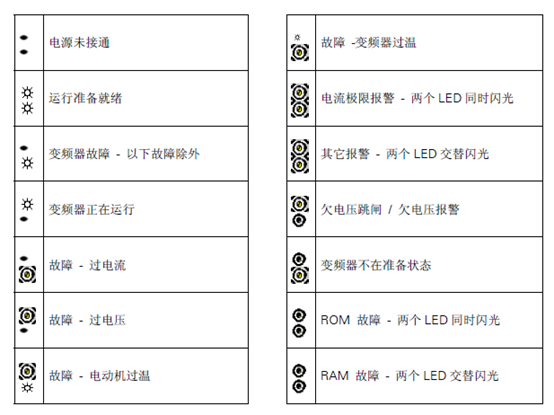 西門子變頻器的上,下兩個ALM指示燈有四種狀態,分別是燈滅,長亮,快速閃爍,和閃爍,分別代下以下含義: