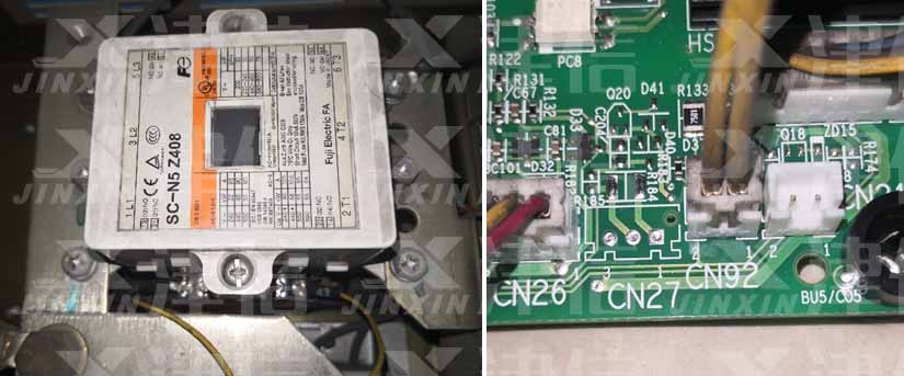- 發(fā)現(xiàn)在報警UV的情況下,變頻器內(nèi)部主回路接觸器先吸合了后再被斷開。測量主電源以及整流模塊都正常,根據(jù)這種現(xiàn)象,初步判斷接觸器以及接觸器相關(guān)回路有異常。檢查相關(guān)線路,測量接觸器線圈控制電壓正常,測量功率卡上插口CN92信號線未導(dǎo)通,該信號線為接觸器輔助觸點反饋信號。如下圖: