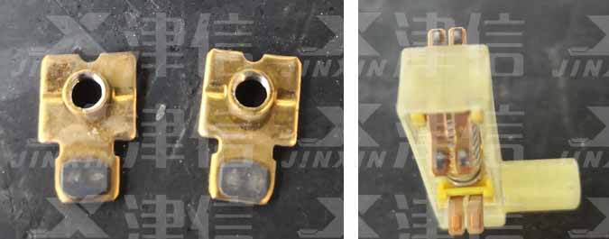 - 斷開主電源,將變頻器內(nèi)部主回路接觸器拆出,將該接觸器拆卸,發(fā)現(xiàn)內(nèi)部輔助觸頭表面氧化,觸頭接觸不牢靠,導(dǎo)致出現(xiàn)不導(dǎo)通現(xiàn)象。